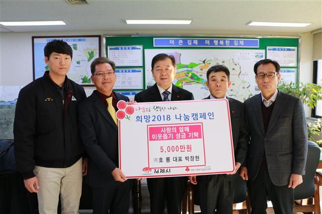 김제시 만경읍 소재 (주)호룡(대표 박장현)은 27일 관내 저소득층 및 복지사각지대 등 생활형편이 어려운 이웃에 써 달라며 이웃돕기성금 5000만원을 김제시에 지정 기탁했다.