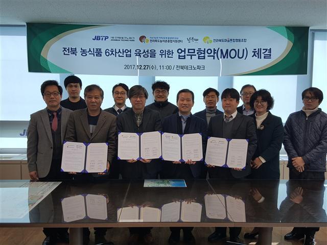 (재)전북테크노파크(원장 강신재)는 전북 농생명 식품분야의 성장 기반 확충을 위한 지원 정책의 개발과 수행을 위해 27일 전북농어촌종합지원센터, (사)전북100, 전북마을통합협동조합과 함께 전북 농식품 6차산업 육성을 위한 협무협약을 체결했다.
