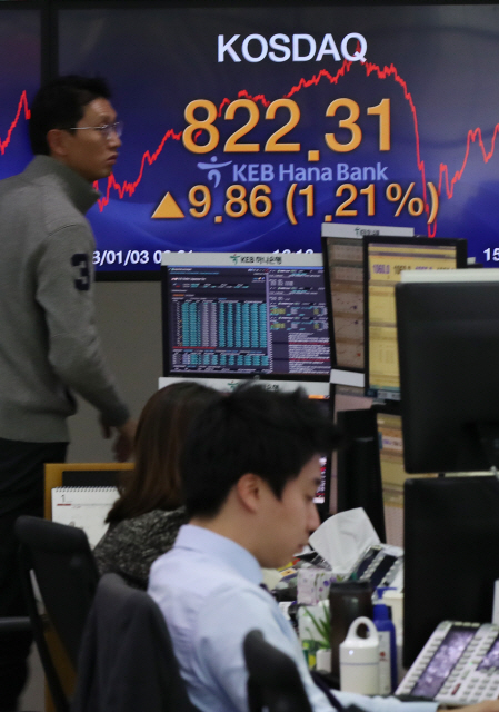 코스닥이 6거래일째 상승했다. 3일 코스닥지수는 전 거래일보다 9.86포인트(1.21%) 오른 822.31에 거래를 마쳤다. 사진은 이날 서울 중구 을지로 KEB하나은행 딜링룸 전광판. 연합뉴스