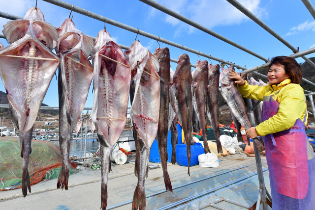 “아지매, 생대구 한 마리 얼마예요?”. 쌀쌀한 바람이 부는 지난 12월 11일 오전 거제시 장목면 외포항. 지나가는 손님이 가게 앞에 펼쳐져 있는 대구를 보고 여주인에게 무심한 듯한 말투로 가격을 물었다. 여주인은 가격보다 대구의 질을 강조하며 대구 꼬리를 잡아 올렸다. “그놈 진짜 크고 싱싱하네. 대구는 대가리 크기를 봐야 전체 크기를 알 수 있다카던데.” 1m 남짓한 대구가 여주인의 손에 일자로 매달렸다. 그 길이에 논란 손님은 입을 다물지 못했다. 흥정은 이미 끝난 것 같았다. 거래가 성사되자 여주인은 직접 가져갈지, 택배로 보낼지를 손님에게 물었다. 이미 여주인의 가게에는 택배에 쓰일 흰 스티로폼 상자가 산을 이루고 있었다. 배송 여부가 결정되자 곧바로 해체 작업이 시작됐다. ‘탁,탁,탁’. 수십 년은 족히 되어 보이는 칼이 거칠고도 섬세하게 그리고 순식간에 대구의 살과 뼈를 갈라내고 대가리를 두 동강 냈다. 칼을 내리치는 데 일말의 주저함 없었다. 프로의 솜씨다. 손님은 “대구는 뼈가 굵으므로 가게에서 손질하지 않으면 집에서 요리하기 버겁다”며 팁을 알려줬다. 여주인은 이리(곤이, 물고기 수컷의 배 속에 있는 흰 정액 덩어리)를 어떻게 처리할지 묻는다. 대구는 이리 유무에 따라 가격 차이가 날 뿐만 아니라 맛도 좌우한다. 생대구 손질을 찰나(刹那)의 예술이라고 부를 수 있다면, 반건조 대구는 인고(忍苦)의 시간이 필요하다. 반건조 대구는 수컷의 경우 이미 산란을 마쳐 이리가 없거나 암컷의 경우 알집이 야물지 않은 것들이 주로 선정된다. 내장을 발라내고 배를 드러낸다. 크게 벌린 아가리에 고리를 걸고 이를 바람이 잘 부는 부둣가 어귀에 매단다. 적어도 3~4일을 해풍에 말려야 먹기 좋게 쫀득해진다고 한다.