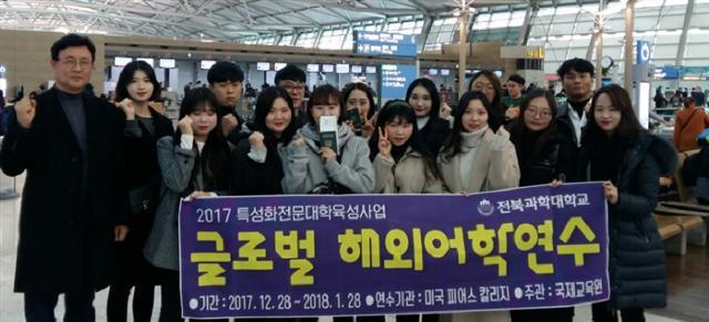 전북과학대학교(총장 황인창)는 재학생 15명이 특성화전문대학육성사업의 일환으로 지난달 18일부터 1월18일까지 한 달 동안 미국 피어스 칼리지(Pierce College)에서 해외 어학연수를 실시하고 있다고 밝혔다.