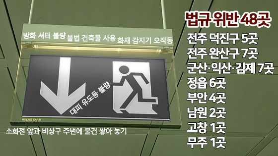 소화기 비치 않고 화재 감지기·방화셔터'불량' / 비상구 주변에 물건 쌓거나 임시건물까지 설치 / 전북소방본부, 48개소 적발