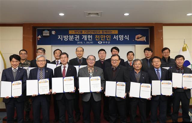 무주군 관내 기관단체장들이 지방분권 개헌 천만인 서명운동에 동참했다.