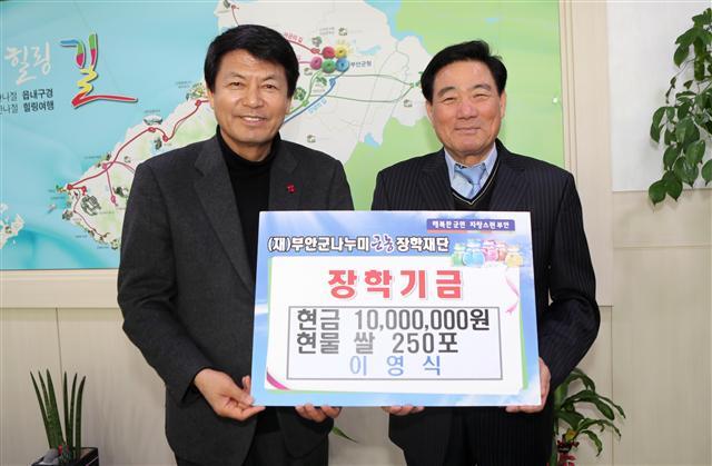 ▲ 8년째 장학금을 기탁해 온 부안강산명주 이영식 회장(오른쪽)이 29일 부안군 나누미근농장학금 1000만원을 기탁했다.