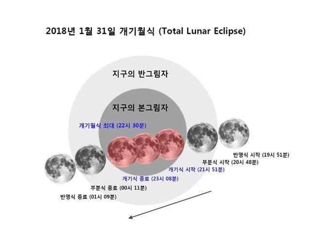 이날 개기월식은 저녁 8시 48분 부분식으로 시작해 9시 51분부터 11시 8분까지 약 1시간 17분 동안 달이 지구 그림자 속에 완전히 들어가는 개기식으로 진행되며 자정 0시 11분을 끝으로 종료될 예정이다.