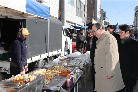 ▲ 황정수 무주군수가 전통시장을 찾아 상인들을 격려하고 있다.
