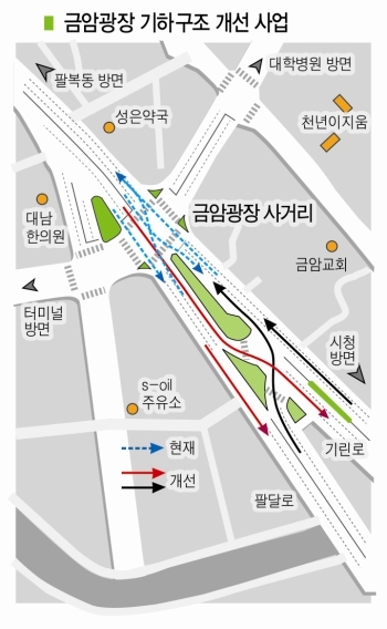 시는 이 150여m 구간 중앙이나 현재 대기환경표지판이 있는 금암광장에 작은 분수대를 조성한다는 계획도 세워놓고 있다. 또 150여m 구간에 시내버스 중앙차로제를 도입할지 여부도 교통부서가 함께 논의하고 있다.