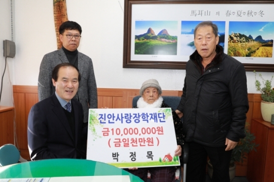 구순 할머니가 거액의 장학금을 쾌척해 지역사회가 훈훈하다. 훈훈함의 진원지는 진안 주천면 금평마을에 사는 박정목 할머니. 올해 구순을 맞이한 박 할머니는 지역 인재양성에 써달라며 1일 진안사랑장학재단에 1000만원을 기탁했다.
