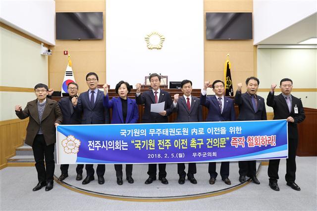 ▲ 5일 무주군의회 의원들이 지난 1일 전주시의회가 채택한 ‘국기원 전주 이전 촉구 건의문’을 즉각 철회하라고 촉구하고 있다.