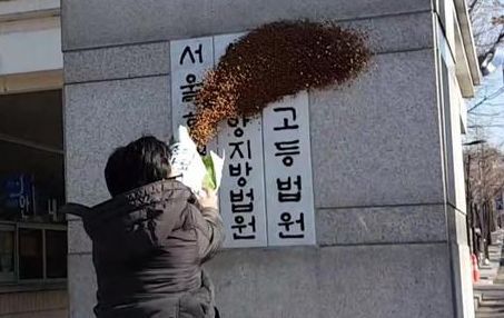 ‘둥글이’라는 애칭을 쓰는 박 씨의 페이스북 계정에는 “오늘 오전 11시에 서울고법에 가서 현판에 개 사료를 살포했다”며 “이 부회장의 판결을 내린 고등법원의 모습을 한탄한다”는 내용의 글과 사진이 공개됐다.