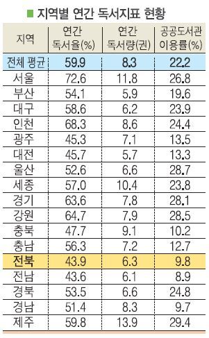 전북도민의 1인당 연간 평균 독서량은 6.3권으로, 전국 평균 8.3권에 못 미쳤다. 또 평균 독서시간도 17.2분으로 전국 평균(23.4분)보다 적다.