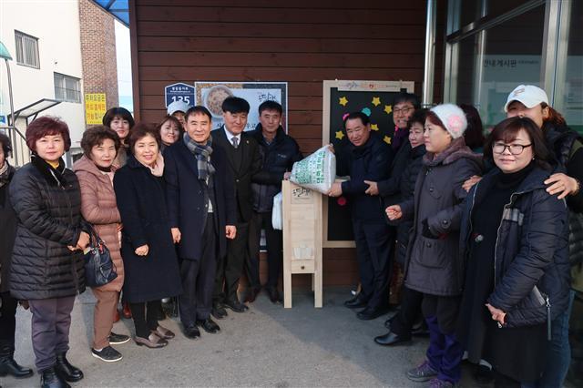 ▲ 완주 봉동읍사무소와 봉동농협 등 2곳에 나눔 뒤주인 ‘생강골 옹달샘’이 설치된 가운데 봉동읍지역사회보장협의체 회원을 비롯한 참석자들이 기념촬영을 하고 있다.
