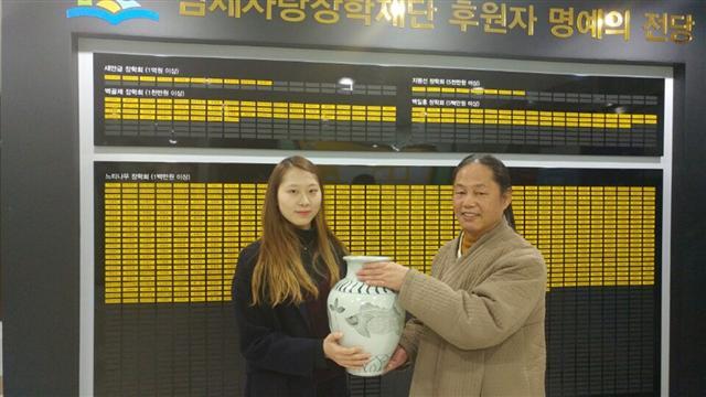 이날 강 양에게 전달된 분청사기 도자기는 가로 20㎝, 세로 30㎝로, ‘강정은 양의 서울대 합격을 축하한다’는 글귀가 새겨져 있다.