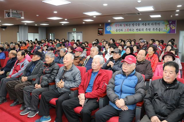 ▲ 지난 28일 무주읍 행정복지센터에서 열린 노인사회활동지원 발대식에서 참석자들이 안전교육을 듣고 있다.