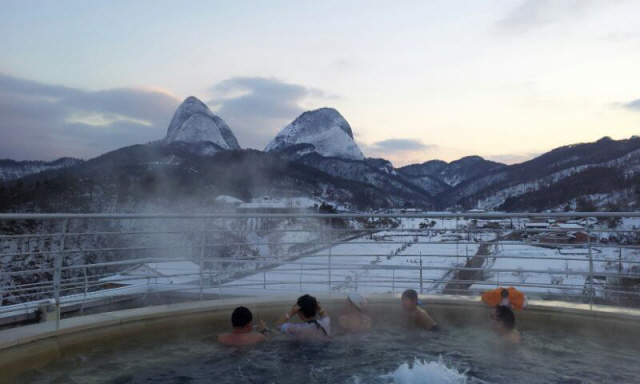 줄을 서야만 이용 가능한 야외 스파는 마이산 절경을 바라보며 노천욕을 즐길 수 있다.