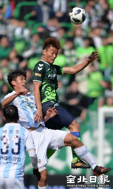 ▲ 내꺼야 2018 프로축구 KEB하나은행 K리그 전북현대와 울산현대의 개막전 경기가 열린 1일 전주월드컵경기장에서 선수들이 공중 볼 경합을 벌이고 있다. 박형민 기자