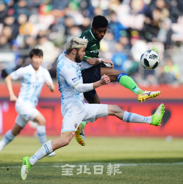 2018 프로축구 KEB하나은행 K리그 전북현대와 울산현대의 개막전 경기가 열린 1일 전주월드컵경기장에서 선수들이 공중 볼 경합을 벌이고 있다. 박형민 기자