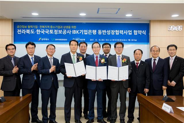 ▲ 한국국토정보공사는 6일 중소벤처기업부와 동반성장위원회가 주관하는‘2017년도 공공기관 중소기업 지원계획 및 추진실적평가’에서 최고 등급을 달성했다. 사진은 지난해 전북도·한국국토정보공사·기업은행과 동반성장협력사업 협약식 장면.