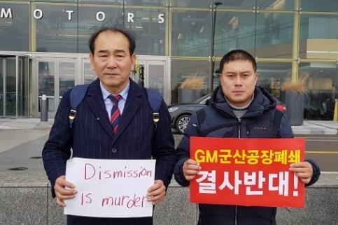 전북도의회 더불어민주당 원내대표인 박재만 도의원과 장현철 한국지엠 군산공장 비정규직 해고 비상대책위원회 위원장이 미국 디트로이트 GM본사를 방문해 ‘군산 공장 폐쇄 철회’를 촉구했다.