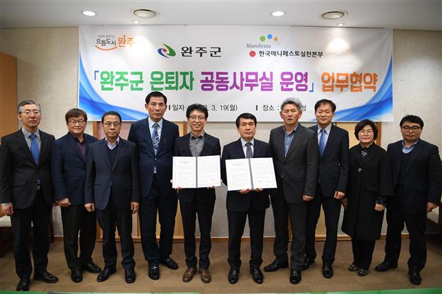완주군과 한국매니페스토실천본부(이광재 사무총장)는 19일 완주군청에서 ‘4060세대 은퇴자 공동사무실 운영을 위한 상호협력 업무협약’을 체결했다.
