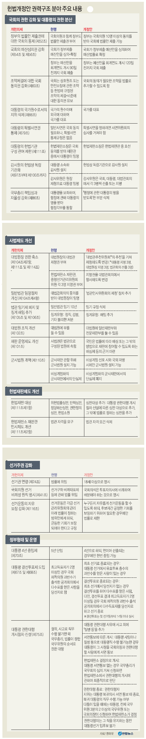 이에 대해 한 수석은 “개헌의 출발은 대선 당시 이번 지방선거에 맞춰서 개헌하자는 약속을 국민께 드린 데에 있다”면서 “그러나 지금까지 국회에서 아무런 결론이안난 상태에서 발의할 수밖에 없는 임계점에 왔다”고 설명했다. 연합뉴스