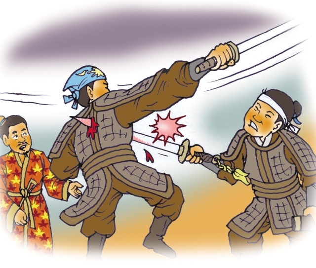 그 순간에 계백과 부딪친 무장의 칼이 엄청난 기세로 내려쳐졌다. 계백은 무장에게 달려가면서 무장과는 반대로 치켜든 칼을 내렸다. 그래서 둘이 부딪쳤을 때는 칼이 어깨에 비스듬히 걸쳐진 자세, 수비 자세다. 상대가 내려칠 것을 예상하고 기다린 자세, 그 순간 무장의 칼이 벼락처럼 계백의 머리끝을 쳤다. 기다리고 있던 계백이 어깨를 틀면서 걸치고 있던 칼로 무장의 가슴을 찔렀다.