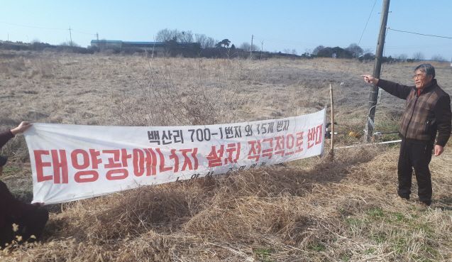 마을 주민은 “마을 조망권을 훼손한다” “주변 과수원에 빛 피해를 준다” “태양광 패널 때문에 비가 오면 토사가 흘러내릴 거다”라며 불만을 쏟아냈다. 이들은 태양광 반대 서명을 모아 시청에 내고, 현수막을 마을 곳곳에 내걸었다.