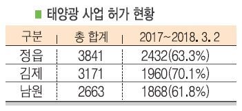 4일 본보가 정읍시·김제시·남원시에서 제출받은 자료를 분석한 결과 유독 지난해부터 태양광 허가가 집중된 것으로 나타났다. 정읍에서는 3841건의 태양광 허가 중 2432건(63.3%)이 지난해부터 지난달 2일까지로 집계됐다. 남원과 김제의 경우에도 70.1%(1868건), 61.8%(1960건)가 지난해부터 이뤄졌다.