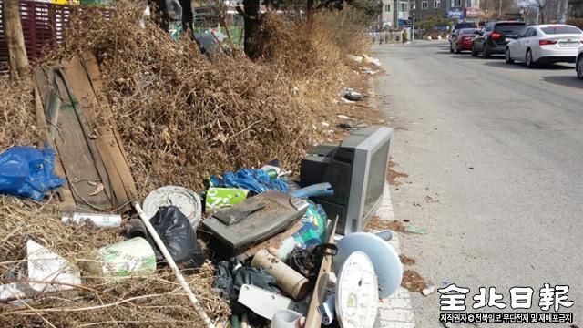 ▲ 전주시 삼천동 월선마을 앞 도로에 수북이 쌓여 있는 각종 쓰레기.