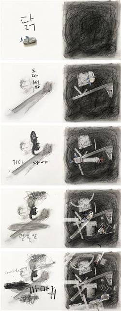 그림책 <지우개> 에서는 연필과 지우개의 기능이 뒤바뀐다. 연필로 글씨 위를 까맣게 칠해 글씨를 지워버리고, 까만 바탕을 지우개로 지워 그림이나 글씨를 만들어낸다. 사물에는 한 가지 모습만 있는 게 아니라 수많은 모습이 있고, 그 모습은 우리가 어떻게 보느냐에 따라 달리 보인다는 취지가 담겼다. 지우개>