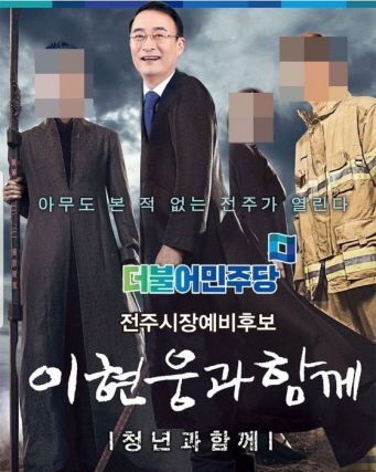영화 ‘신과 함께’를 패러디한 홍보물에는 연예인의 몸에 이현웅 전주시장 예비후보 및 임모 씨(36) 등 4명의 얼굴 사진이 합성됐다. 이 중 사진 맨 왼쪽에 등장하는 임 씨는 지난 19일 도내 대학가 4곳을 돌며 김승수 예비후보 비방 대자보를 붙인 일당 4명 중 1명과 동일인물이다.