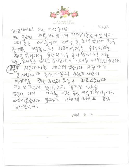 편지에는 “저의 꿈은 아이돌이에요. 요즘에는 일주일에 한 번 뮤지컬을 배우고 있습니다. 부끄럽지 않게 저의 일을 열심히 해 아이돌이란 꿈을 이루기 위해 노력하겠습니다. 앞으로도 기대해주세요. 항상 감사합니다”고 적었다.