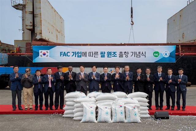 농림축산식품부와 한국농수산식품유통공사를 비롯한 쌀 생산 농업인단체 등이 10일 군산항 5부두에서 예멘(1만2000톤)과 에티오피아(1만톤)로 보내질 쌀 2만2000톤을 선적하고 ‘우리쌀 5만톤 첫 원조’ 출항 기념행사를 진행했다. 이날 기념식에는 농식품부 차관과 WFP(세계식량계획국제기구) 본부 데이비드 비술리 사무총장, 에티오피아 주한대사 쉬페르자소, 농해수위 국회의원, 강승구 농축수산식품국장 등 원조 관련 기관 및 농업인 단체 관계자 200여 명이 참석했다. 사진제공=군산시