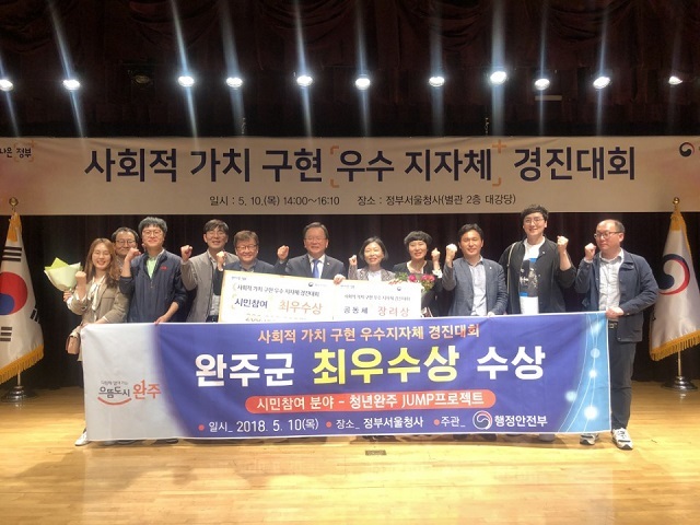완주군에 따르면 행정안전부 주관 ‘사회적 가치 구현 지자체 우수사례 경진대회’에서 시민참여분야의 청년완주 JUMP프로젝트가 최우수, 공동체 분야의 ‘살맛나는 아파트 르네상스’가 장려상을 받았다.
