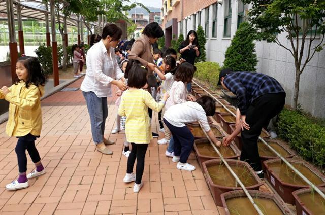아이들은 난생 처음 모를 심어보고 모가 커가는 과정을 설명 듣고 연신 미소를 지었다.