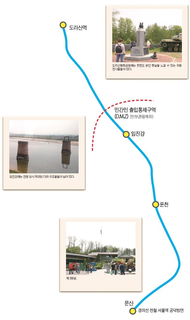 이번에 방문한 경의선 DMZ 트레인이 중심 코스인 도라산역과 도라산정만대, 도라산 평화공원, 제3땅굴 등은 민통선 안에 있기 때문에 미리 신청한 사람 외에는 방문할 수 없다.