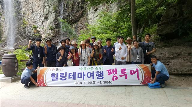 ▲ 29일 순창힐링여행 팸투어 참가자들이 강천산에서 플래카드를 들고 기념촬영을 하고 있다.