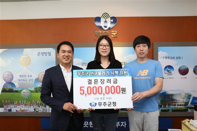 도내 최초로 무주군이 시행하는 결혼장려금 제도의 첫 수혜자가 나왔다.