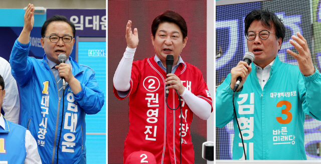접전 양상으로 치닫는 대구시장 선거는 민주당이 ‘공성(攻城)’에 성공하느냐, 한국당이 또다시 ‘수성(守城)’하느냐로 귀결될 전망이다. 민주당 임대윤, 한국당 권영진, 바른미래당 김형기 후보가 출사표를 던진 대구시장 선거는 ‘2강(임·권)-1약(김)’구도가 유지된 채 결승점으로 향하고 있다. 민주당 바람을 탄 임 후보의 약진이 두드러지면서 권 후보와의 양자 대결은 더욱 달아올랐다. 바른미래당 김 후보는 ‘반(反)한국당, 비(非)민주당’ 표심이 자신에게 향할 것이라며 막판 극적 반등을 기대하고 있다.