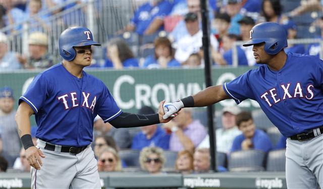 ▲ 텍사스 레인저스의 추신수(왼쪽)가 20일(현지시간) 미국 미주리주 캔자스시티 카우프먼 스타디움에서 열린 캔자스시티 로열스와의 방문경기에서 1회초 노마 마자라의 희생플라이 때 득점한 뒤 아드리안 벨트레의 축하를 받고 있다. 연합뉴스