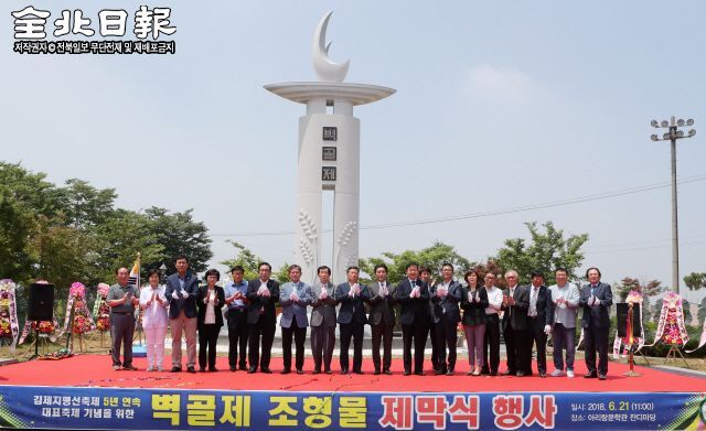 김제지평선축제의 5년 연속 대한민국 대표축제 선정 및 글로벌 육성 축제 선정을 기념하기 위해 세워진 벽골제탑(조형물) 제막식이 21일 벽골제 앞 아리랑문학관 잔디마당 주변에서 성대하게 개최됐다.