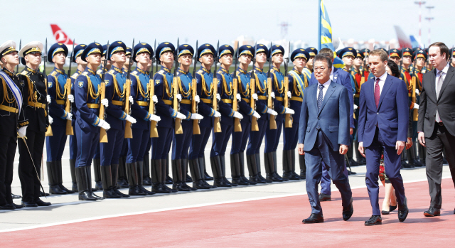 ▲ 러시아를 국빈방문하는 문재인 대통령과 부인 김정숙 여사가 21일 오후 러시아 모스크바 브누코보 국제공항에 도착, 환영 의장대를 사열하고 있다. ·연합뉴스