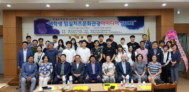 ▲ 26일 임실치즈농협이 주최한 임실치즈 탄생 50주년을 기념하는‘지역대학생 임실치즈문화관광아이디어 발표회’에서 참석자들이 기념촬영을 하고 있다.