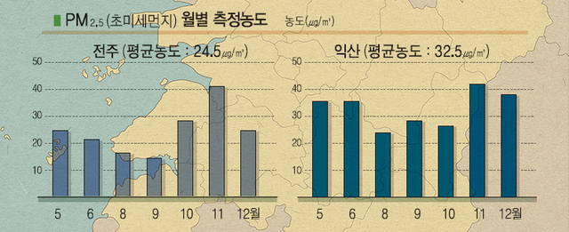 해당기간 전주의 PM 2.5 평균농도는 24.5㎍/㎥, 익산은 32.5㎍/㎥다. 특히 익산의 PM 2.5농도는 서울에서 지난 2012년 2월부터 2013년 1월까지 측정한 PM 2.5농도(27.2㎍/㎥)보다 높다. 송 교수는 “전북에서는 이온성분과 탄소성분, 중금속 성분이 주요오염성분으로 나타났다”고 설명했다.