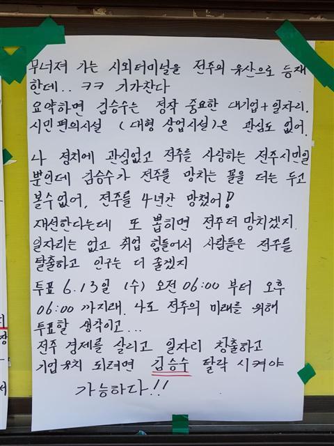 당시 김 후보 측은 “이들이 대자보를 붙인 뒤 검정색 제네시스 차량을 타고 전주시내 모 예비후보 선거사무소 건물 주차장으로 이동하는 모습을 확인했다”며 “게다가 대자보 사진이 해당 후보 가족의 SNS 계정을 통해 모 언론사 기자에게 전달된 정황을 파악했다”고 주장했었다.