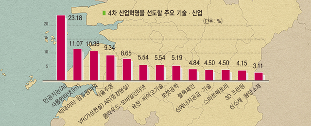 도내 기업들이 생각하는 4차 산업혁명의 핵심 기술로는 ‘인공지능’(23.18%), ‘사물인터넷’(11.07%), ‘빅데이터·컴퓨팅 파워’(10.38%), ‘자율주행’(9.34%) 등의 순으로 나타났다.