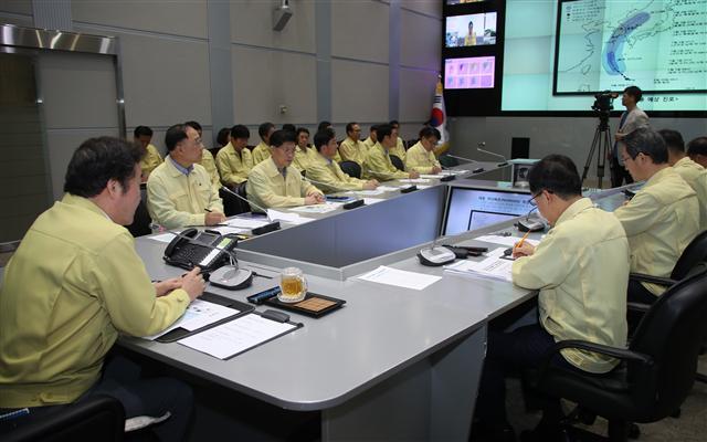 이낙연 국무총리가 휴일인 1일 오후 서울 세종로 정부서울청사의 중앙재난안전상황실을 방문해 제7호 태풍 쁘라삐룬의 북상에 따라 대처상황을 점검하고 있다. 연합뉴스