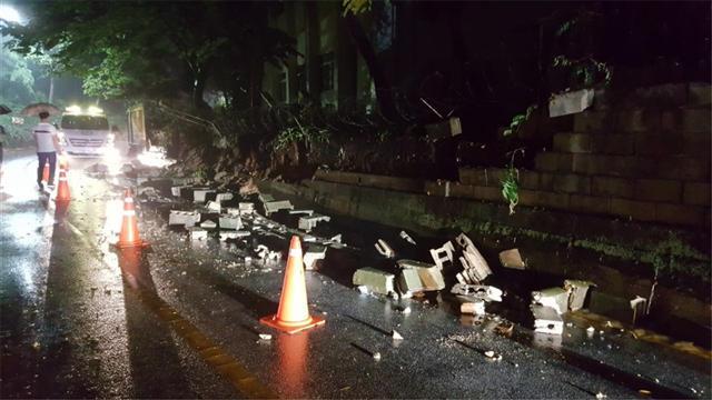 ▲ 지난달 29일 내린 비로 익산 남성고등학교 담장 일부가 무너졌다. .사진제공=전북도
