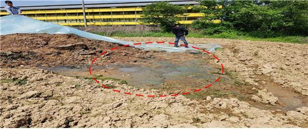 ▲ 고창군 농공단지 내 한 사업장에서 폐기물을 사업장 인근 부지에 보관해 침출수가 인근 우수로로 유입돼 주변 땅을 오염시키고 있다. 사진제공=새만금지방환경청
