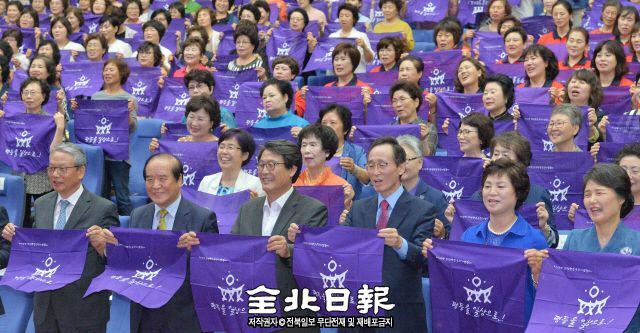 2018 양성평등주간 기념행사가 열린 4일 전북도청 공연장에서 송하진 도지사, 김광수 국회의원, 윤석정 전북일보 사장, 임양순 전북여성단체협의회회장 및 여성단체 회원들이 ‘평등을 일상으로!’라고 쓰여진 손수건을 들고 양성평등을 외치는 퍼포먼스를 하고 있다.